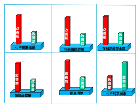 生產(chǎn)線的升級解決了孤島式批量生產(chǎn)的方式,實(shí)現(xiàn)了連續(xù)流生產(chǎn)模式,在線庫存金額從60萬降為10萬,在制品從50000件降至5000件。車間在建設(shè)連續(xù)流生產(chǎn)方式時,遵循精益生產(chǎn)思想,通過連續(xù)流生產(chǎn)、ECRS工序改善培養(yǎng)多能工、使用自働化工裝等方式,逐步實(shí)現(xiàn)對原有生產(chǎn)模式的升級改造。項(xiàng)目取得了較好的效果。