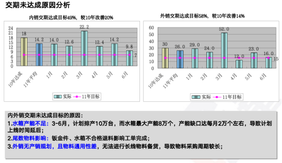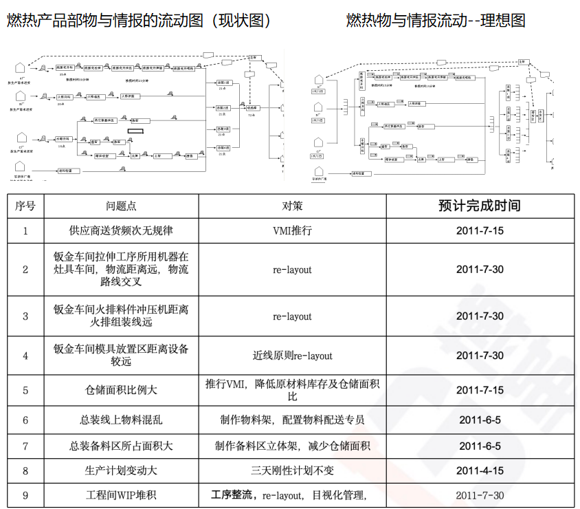 通過(guò)對(duì)配件車(chē)間內(nèi)油壓機(jī),火排沖壓設(shè)備,火排裝配線,水箱沖壓設(shè)備,小U開(kāi)料設(shè)備,總裝車(chē)間備料區(qū)等設(shè)施進(jìn)行重新規(guī)劃、調(diào)整,減少車(chē)間一次物流距離1500M,在制品面積下降63%,庫(kù)存金額下降50%。通過(guò)燃熱產(chǎn)品部物與情報(bào)現(xiàn)狀圖與理想圖對(duì)比,得出目前存在的問(wèn)題并設(shè)置改善對(duì)策。