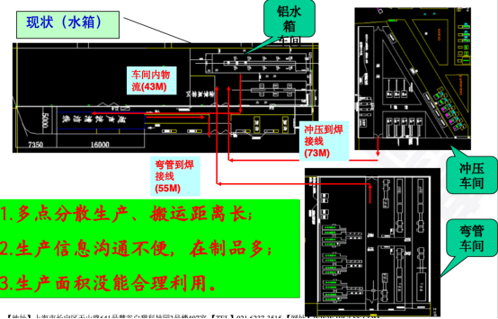 分析鋁水箱車(chē)間物流示意圖發(fā)現(xiàn),鋁水箱沖壓至裝配工序物流距離73M,彎管工序至裝配車(chē)間55米。且存在多點(diǎn)分散生產(chǎn)、搬運(yùn)距離長(zhǎng);生產(chǎn)信息溝通不便,在制品多;生產(chǎn)面積沒(méi)能合理利用等問(wèn)題,因此重新調(diào)整生產(chǎn)布局,簡(jiǎn)化物流路線。