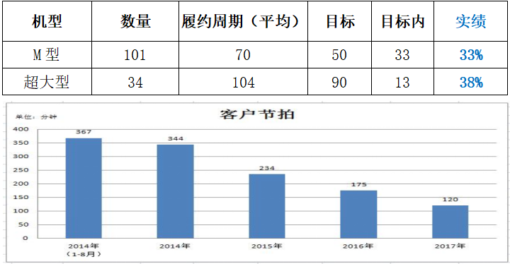 分析當(dāng)前數(shù)據(jù),此兩款產(chǎn)品交付履約率分別為33%和38%,無法滿足客戶需求,且根據(jù)公司發(fā)展目標(biāo)和客戶未來需求預(yù)測(cè),未來4年,客戶生產(chǎn)節(jié)拍將由367分鐘降低至120分鐘,因此通過價(jià)值流分析,縮短產(chǎn)品交付周期提高訂單準(zhǔn)時(shí)履約率成為迫切需要解決的一大問題。