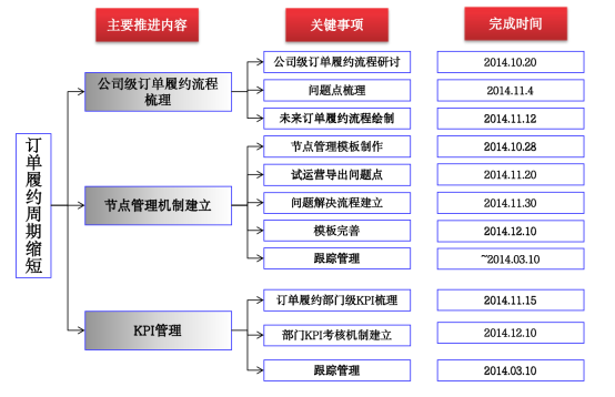 (3)制定項(xiàng)目進(jìn)度跟蹤關(guān)鍵節(jié)點(diǎn)表,通過建立共同管理模版、各部門日常更新管理、日清會(huì)議協(xié)調(diào)機(jī)制,加強(qiáng)訂單履約過程目標(biāo)管理。