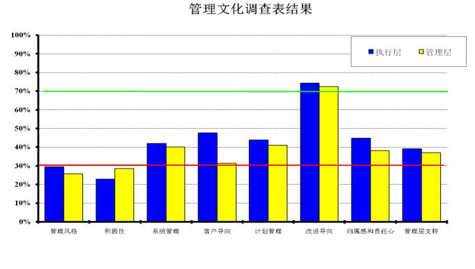 結論:員工和管理人員在“積極性” “管理風格” 方面認同感和滿意度最差, 全員“改進導向”比較強烈,說明大家希望變革。
