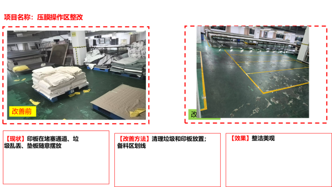 隨后,對所有物品實施“三定”管理:定置(確定存放位置)、定容(明確容器和容量)、定標(biāo)示(標(biāo)識清晰易辨)。通過系統(tǒng)整頓,不僅優(yōu)化了工作流程,還大幅提高了物料和工具的取用效率。全員積極參與改善活動,累計完成現(xiàn)場改善500項,包括工具擺放合理化、通道暢通化、區(qū)域功能明確化等,為后續(xù)6S深化打下了堅實基礎(chǔ)。