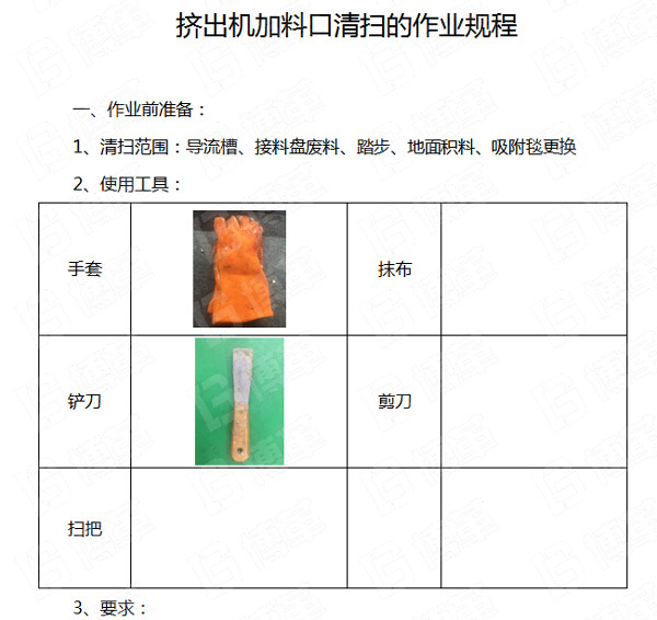 五、通過(guò)本次清掃的活動(dòng),和員工交流和討論,形成了加料口的清掃作業(yè)規(guī)程,作業(yè)規(guī)程共分:作業(yè)前準(zhǔn)備、作業(yè)過(guò)程、作業(yè)后確認(rèn)等三個(gè)步驟。