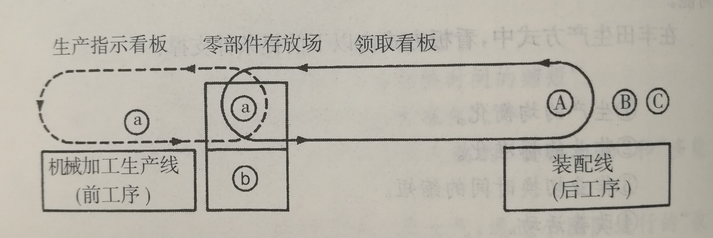 現(xiàn)在,假設(shè)某條裝配線正在生產(chǎn)A、B、C三種產(chǎn)品。生產(chǎn)這些產(chǎn)品需要的零件是a和b,這些零件在作為前工序的機(jī)械加工生產(chǎn)線生產(chǎn)(參看圖1.3)在機(jī)械加工生產(chǎn)線生產(chǎn)的零件a、b存放在該生產(chǎn)線的零部件存放場,掛著該生產(chǎn)線的生產(chǎn)指示看板。