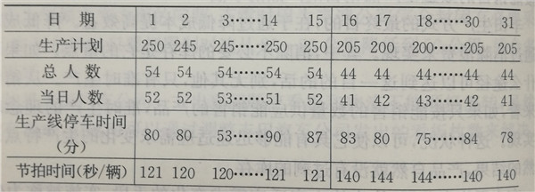 因?yàn)槠嚨男枨蠹竟?jié)性變化大,所以月與月之間生產(chǎn)量的波動(dòng)是不可避免的。但是,在一個(gè)月當(dāng)中,能夠消除天與天之間生產(chǎn)量的波動(dòng)。例如,批量生產(chǎn)的車種花冠的整體生產(chǎn)計(jì)劃,首先要按照那個(gè)月的預(yù)測(cè)需求量制定以月為單位的生產(chǎn)數(shù)量計(jì)劃。通過(guò)簡(jiǎn)單地用這個(gè)月的勞動(dòng)天數(shù)去除月生產(chǎn)數(shù)量,求出每天的生產(chǎn)輛數(shù),就可以計(jì)劃出每天定量生產(chǎn)的平均輛數(shù),這就是總量均衡在這個(gè)總量均衡的概念中,不考慮花冠有多樣的規(guī)格種類,只考慮從整體上看花冠這一大宗車種每天保持的平均生產(chǎn)量。