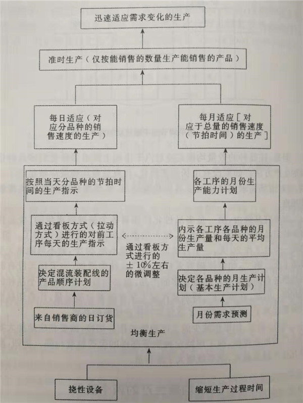 第二階段的每日適應,通過每天的生產指示成為可能。在這里,首先在生產均衡化中,看板方式的作用被顯示出來。這是因為每天的生產指示是靈活運用由看板和順序計劃實現的“拉動方式”來進行的。處于通過看板進行生產指示之出發點的是最終混流裝配線上被指令生產的各種產品的投入順序計劃,豐田汽車公司根據它可以均衡地從零部件供貨廠家和零部件組裝線領取各種零部件。