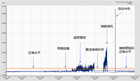 如下圖所示,某機床通過振動分析,可以看到10月18日振動加速度峰值觸發早期預警閾值,但是由于生產計劃問題,沒有停機維護;10月22日機床主控系統觸發故障,不得不停機過10個小時維修和更換軸承,維修后,振動恢復正常水平,但較大損失已經造成。