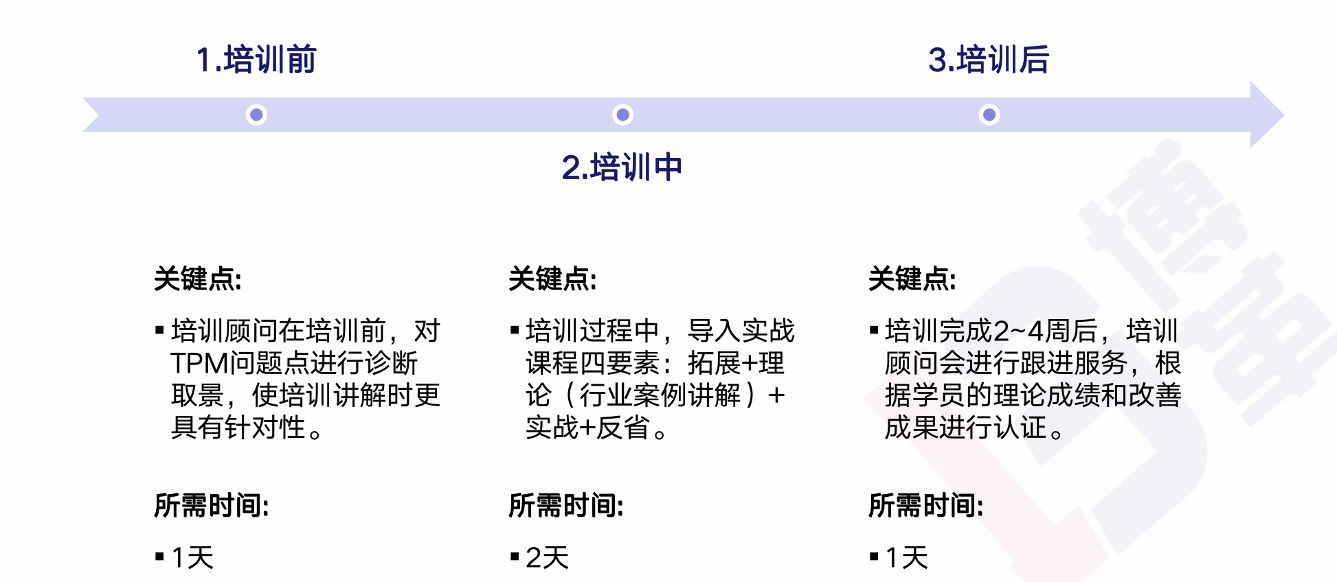 精益TPM實戰培訓是以全員生產性維護TPM管理為主題的精益實戰培訓。該培訓分為三個階段,通過【診斷取景+行業案例講解+現場實戰+培訓后跟蹤服務+認證】的實戰培訓模式,使學員能系統地學習TPM的理論知識,并迅速地應用在實際工作中,使其對TPM管理 工作產生認同感。