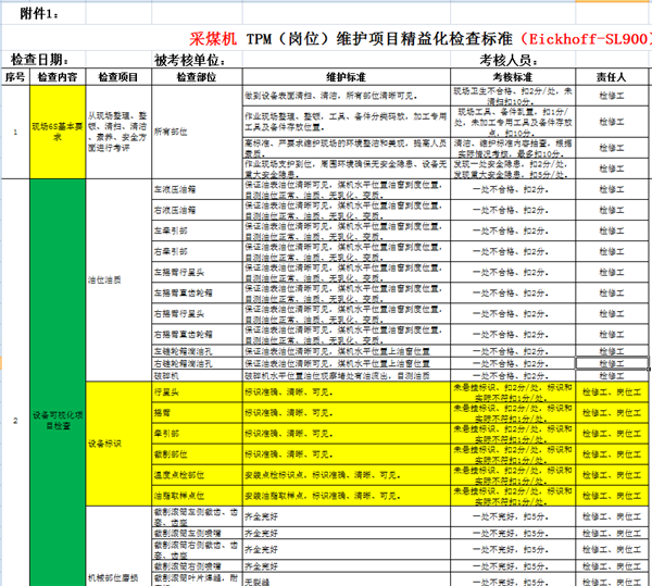 針對主要采掘設(shè)備、主運輸設(shè)備試點,梳理現(xiàn)場6S基本要求、設(shè)備可視化項目檢查、設(shè)備檢修及運行現(xiàn)場動態(tài)檢查、設(shè)備自主保全、全員維護記錄,編制TPM(崗位)維護項目精益化檢查標準工單。