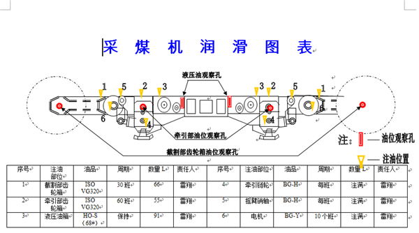 2016年5月份,從綜采隊試點梳理設(shè)備潤滑維護標準可視化基礎(chǔ)提升管理方法,結(jié)合現(xiàn)有設(shè)備圖冊、潤滑標準、TPM可視化相關(guān)要求制作綜合看板,摒棄了以前的文字描述、該方式圖文并茂,有利于相關(guān)人員的掌握,現(xiàn)已在22204-1面開始實施