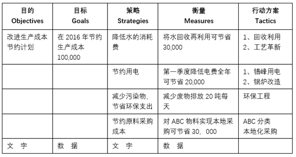 2015年6月份,機電辦精益化管理組編制下發(fā)OGSM目的、目標、策略、衡量、行動方案)分解策略執(zhí)行法試行推廣,該方法旨在理清管理人員系統(tǒng)的想法、精確地分析問題、看到核心問題的所在,最后制定清晰的目的及目標。在梳理目標任務(wù)的同時,將行動方案一并進行落實