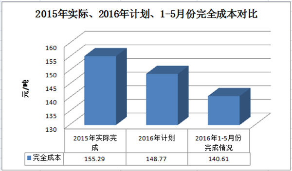 d)完全成本: 2016年全礦完全成本控制指標148.77元/噸,1-5月份實際完成140.61元/噸,較2016年初計劃降低5.80%,較2015年完成情況降低10.44%