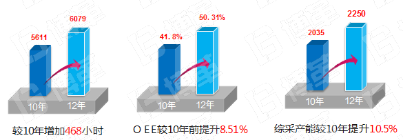 通過以提高設備綜合效率OEE為主要手段的一系列措施實施,綜采較2010年增加實際作業生產時間468小時,可多產煤80多萬噸。目前綜采OEE較2010年提升8.51%;產能較2010年提升10.5%;
