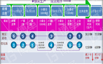 ?優化主運輸系統“開、停”順序,縮短空轉待機時間,通過優化每天可以增加18分鐘的運轉時間,減少27分鐘的空轉時間。